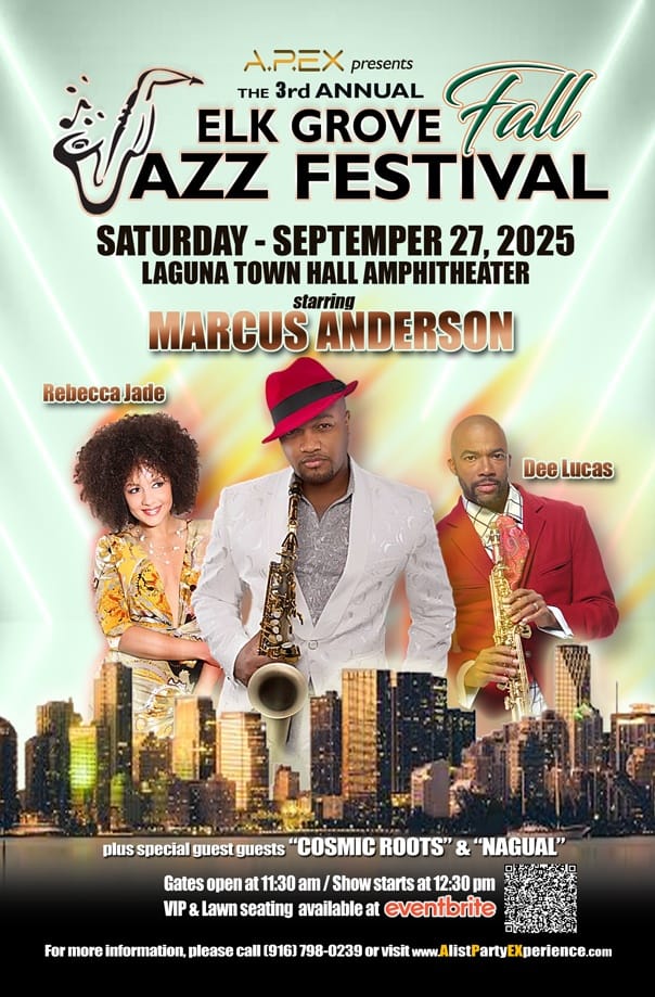 The third annual “ELK GROVE FALL JAZZ FESTIVAL” will happen all day at the Laguna Town Hall Amphitheatre in Elk Grove, CA. This will be a exciting outdoor musical concert that will feature international and local artists. The headliner will be the incredible saxophonist MARCUS ANDERSON.